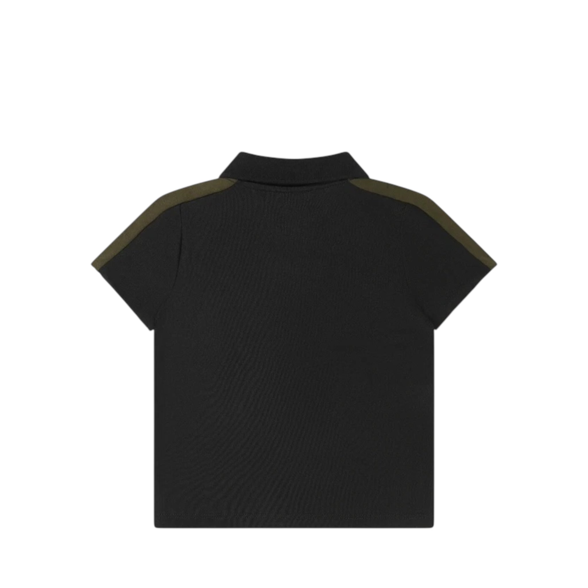 This short-sleeved polo from BOSS is made of cotton-rich material. The stretch piqué knit material has printed stripes on the shoulders and front. One stripe features a tone-on-tone flocked BOSS logo with a raised patent-leather effect.