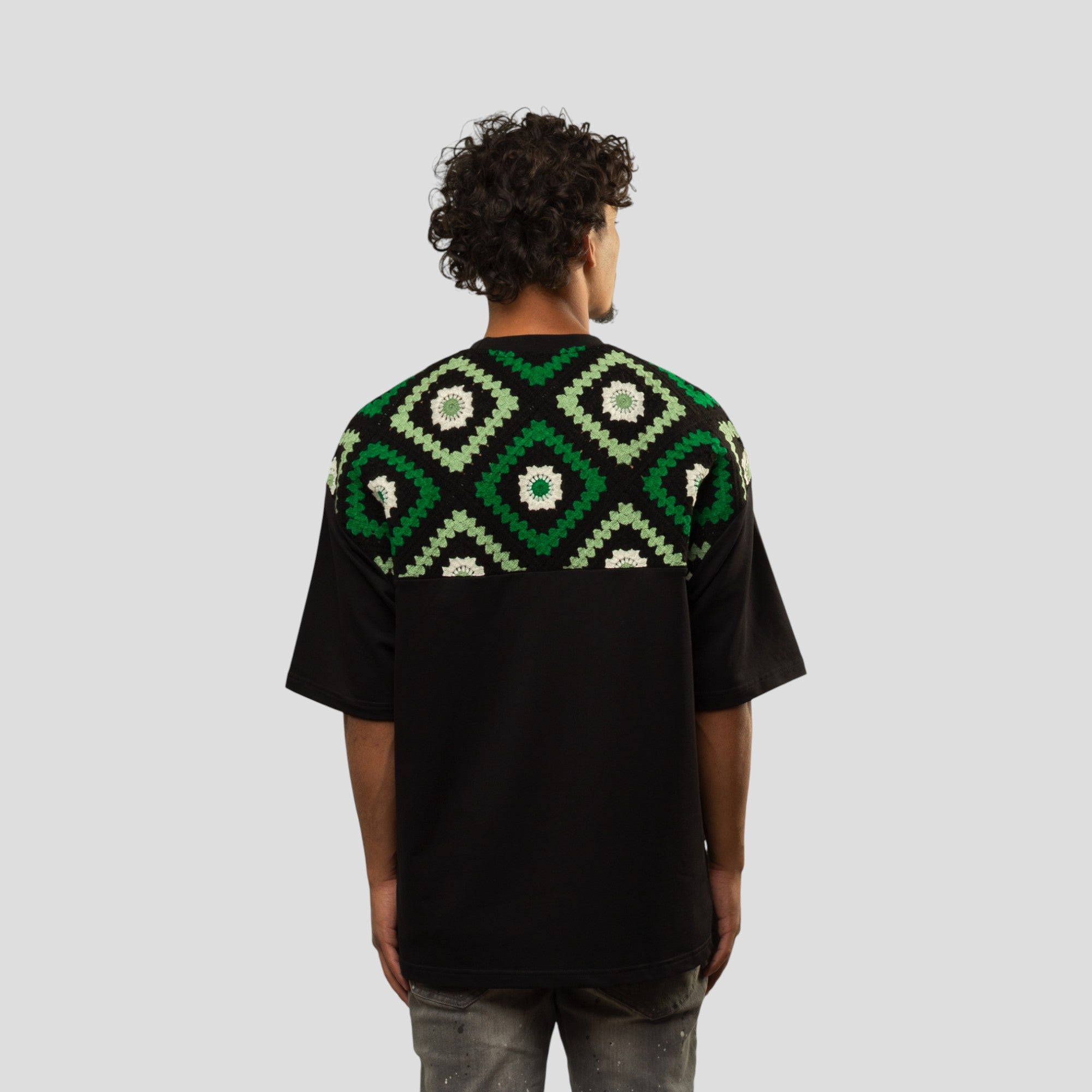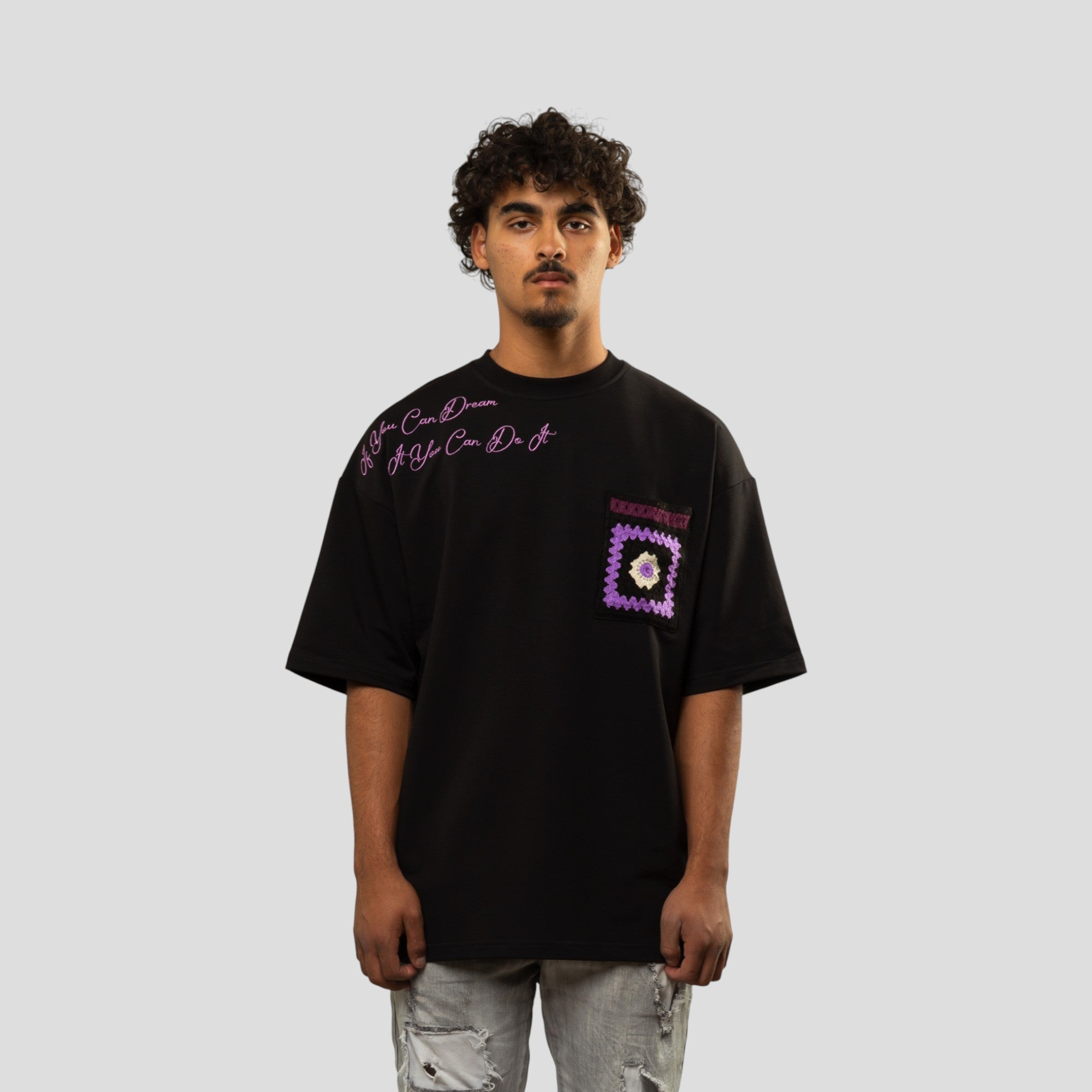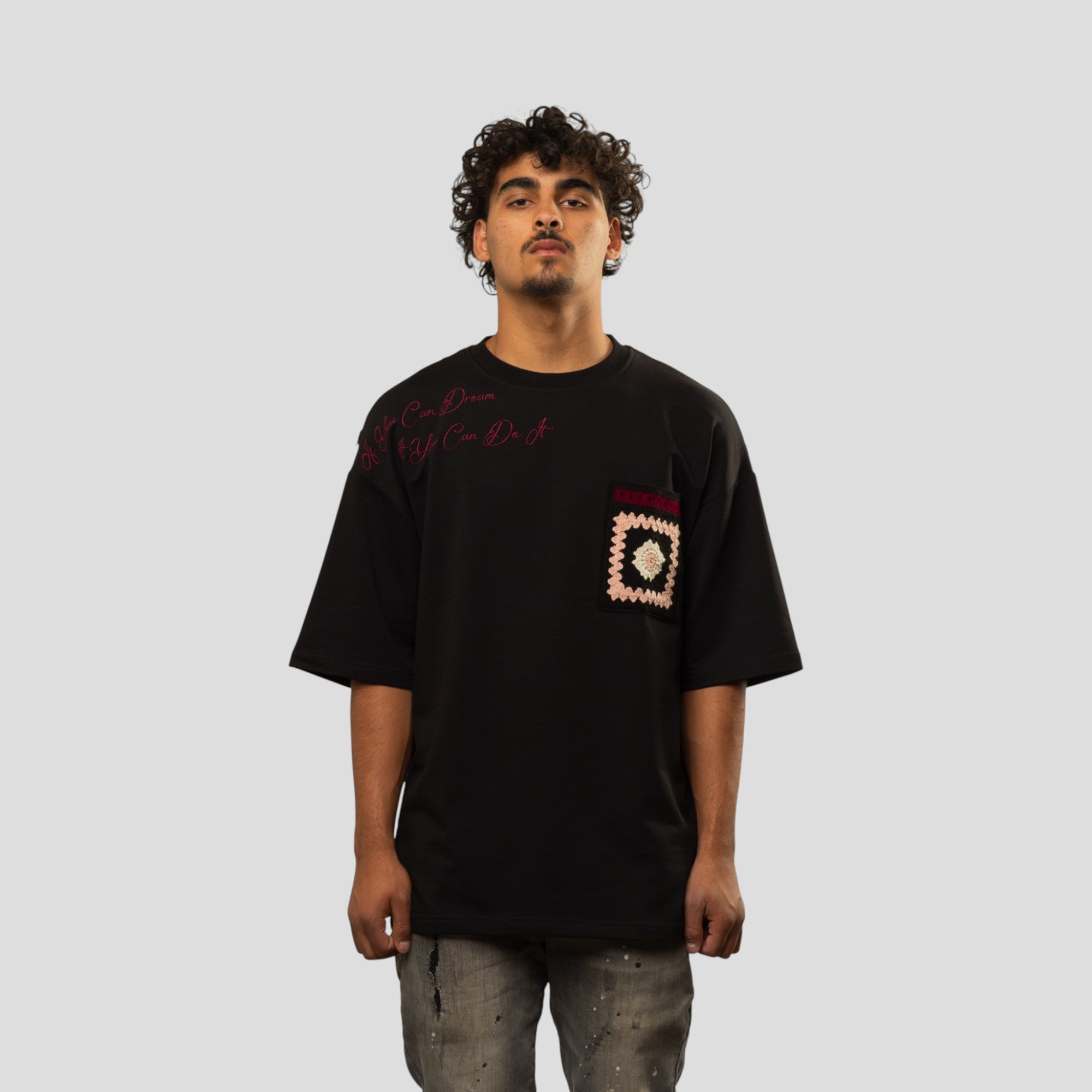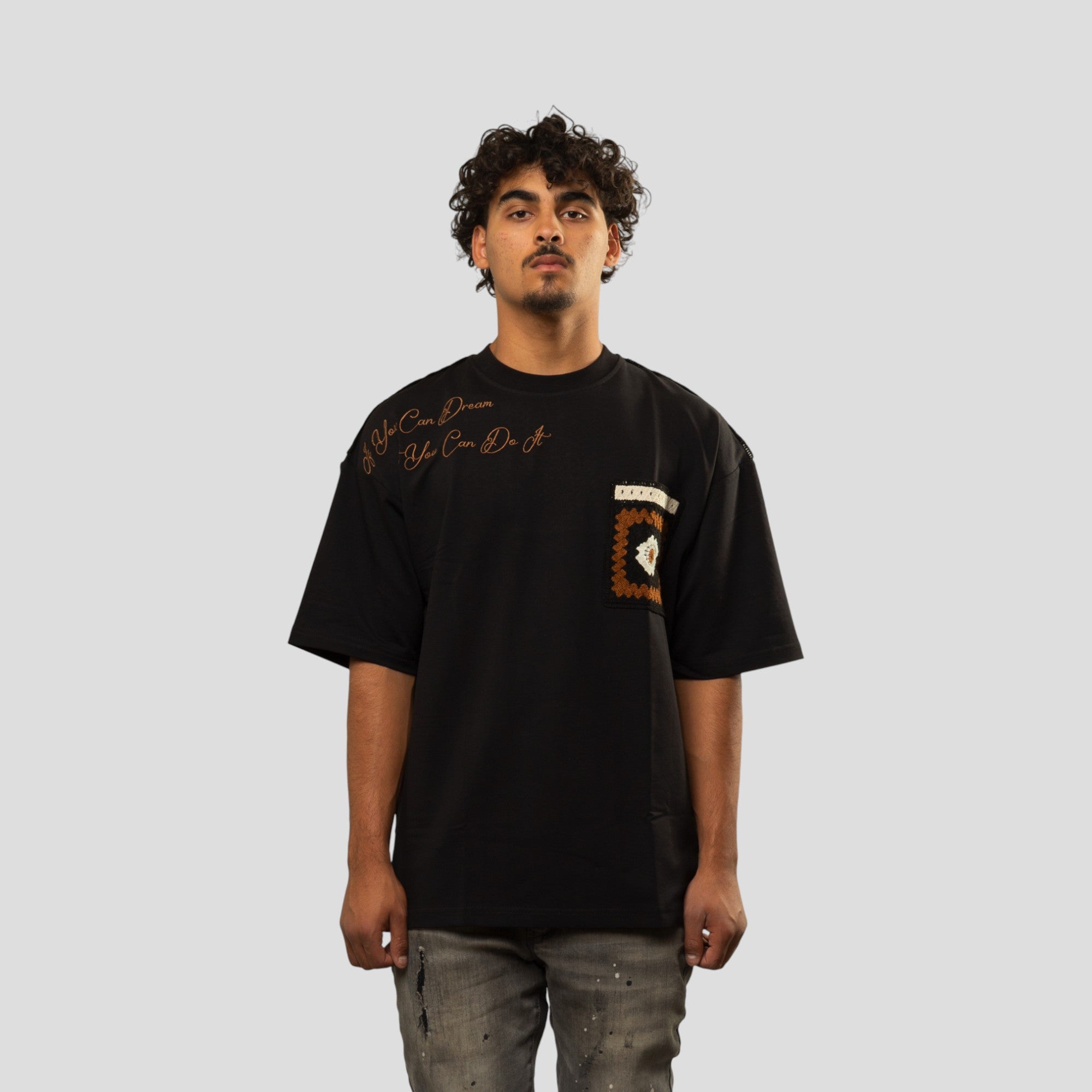 Bring bold optimism to your streetwear lineup with the Blanc Kanvas “Dreamers Do It” T-Shirt. Made from 100% cotton and cut in an oversized silhouette, this tee is built for relaxed comfort with an elevated, handcrafted finish. The front features embroidered script with the inspiring message “If You Can Dream It You Can Do It,” paired with a knit crochet pocket for texture and contrast. Around back, a multi-colored knit crochet panel delivers standout detail and artisanal character. Available in a range of rich colorways, this piece is designed to turn everyday fits into statements.