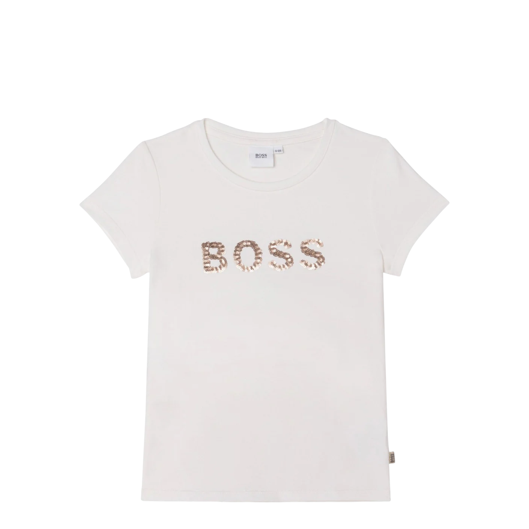Brighten up her everyday wardrobe with this distinctive BOSS Girls' T-Shirt. This premium white tee combines classic comfort with a playful touch of glamour, making it a lively addition to any casual outfit.