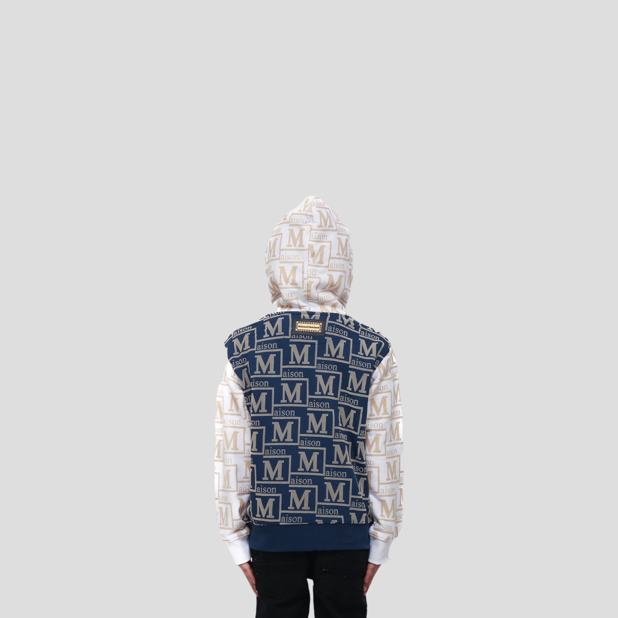 The MDB Couture Kid’s Monogram French Terry Hoodie Sweatshirt from the Navy/Cream Collection delivers cozy comfort with signature Maison de Bouchard style. Crafted from 100% French terry cotton, this hoodie offers a soft, breathable feel with a classic fit made for everyday wear. The flocked all-over monogram logo adds rich, tactile texture across the bold navy body and contrasting cream sleeves, while the leather/metal logo plate on the chest finishes the look with a premium couture touch. Built for kids who move with confidence and style.