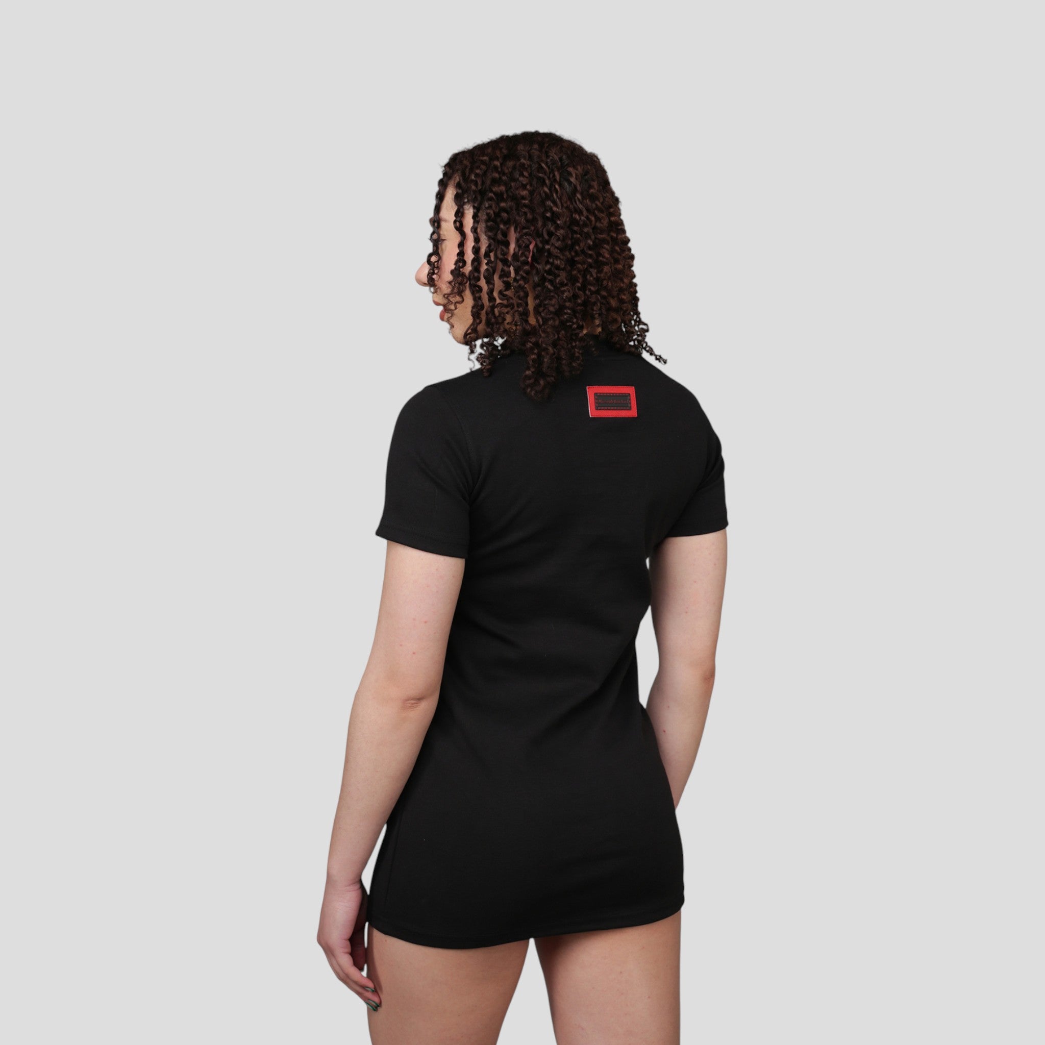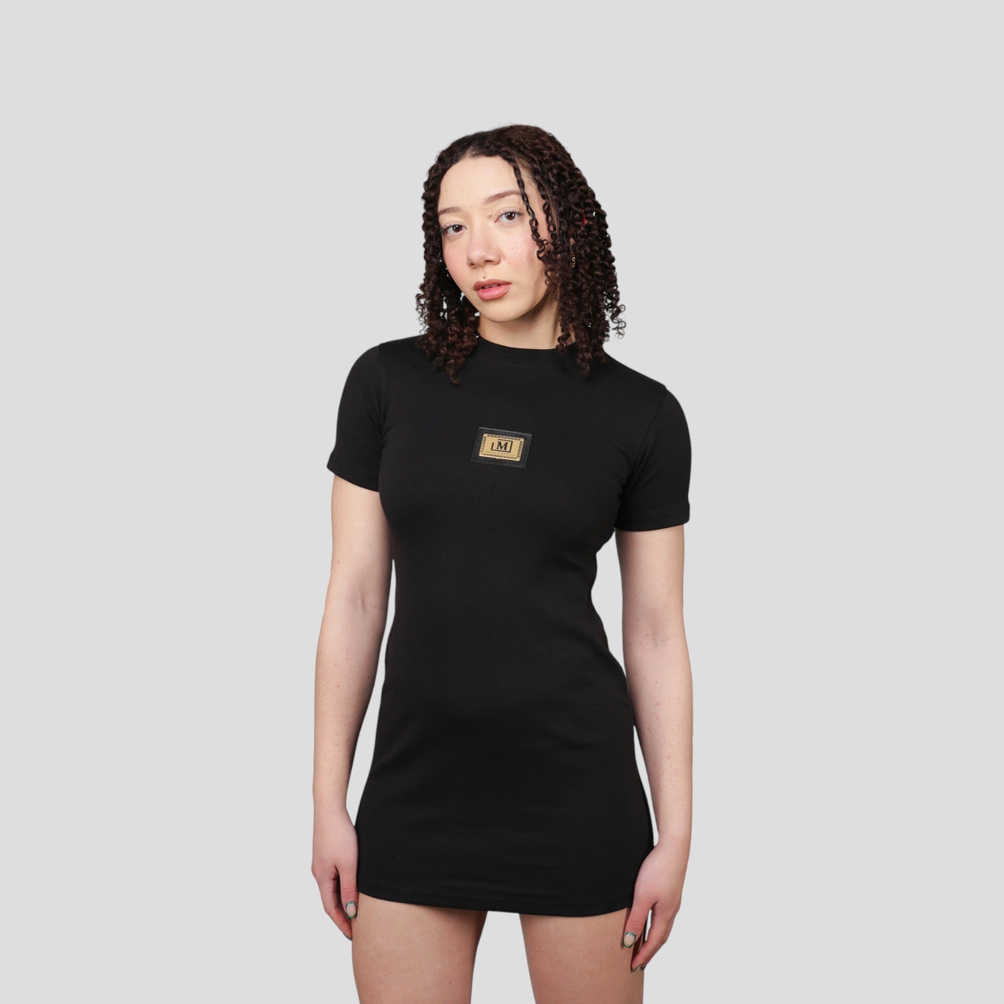 The MDB Couture Women’s Metaluxe Dress from the Black Collection delivers a sleek, body-contouring silhouette with signature Maison de Bouchard luxury. Designed in a slim stretch fit, this short-sleeve mini dress hugs the body with clean lines and effortless comfort. Finished with a “Maison dé Bouchard” metal logo plate on the chest and back neck, plus an M-logo neck emblem, it brings understated couture branding to a timeless, elevated staple. Perfect for day-to-night styling, this piece stands strong on its own or layered with outerwear.
